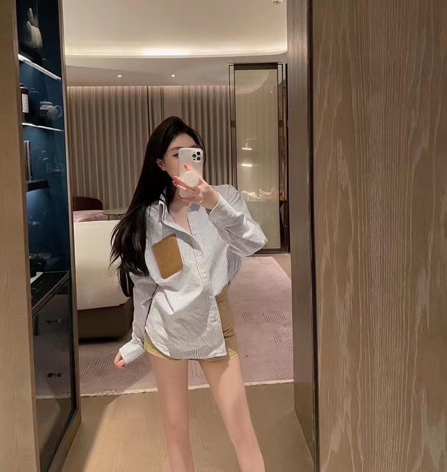 Casual Chic Striped Shirt with Tan Pocket and High-Waisted Shorts